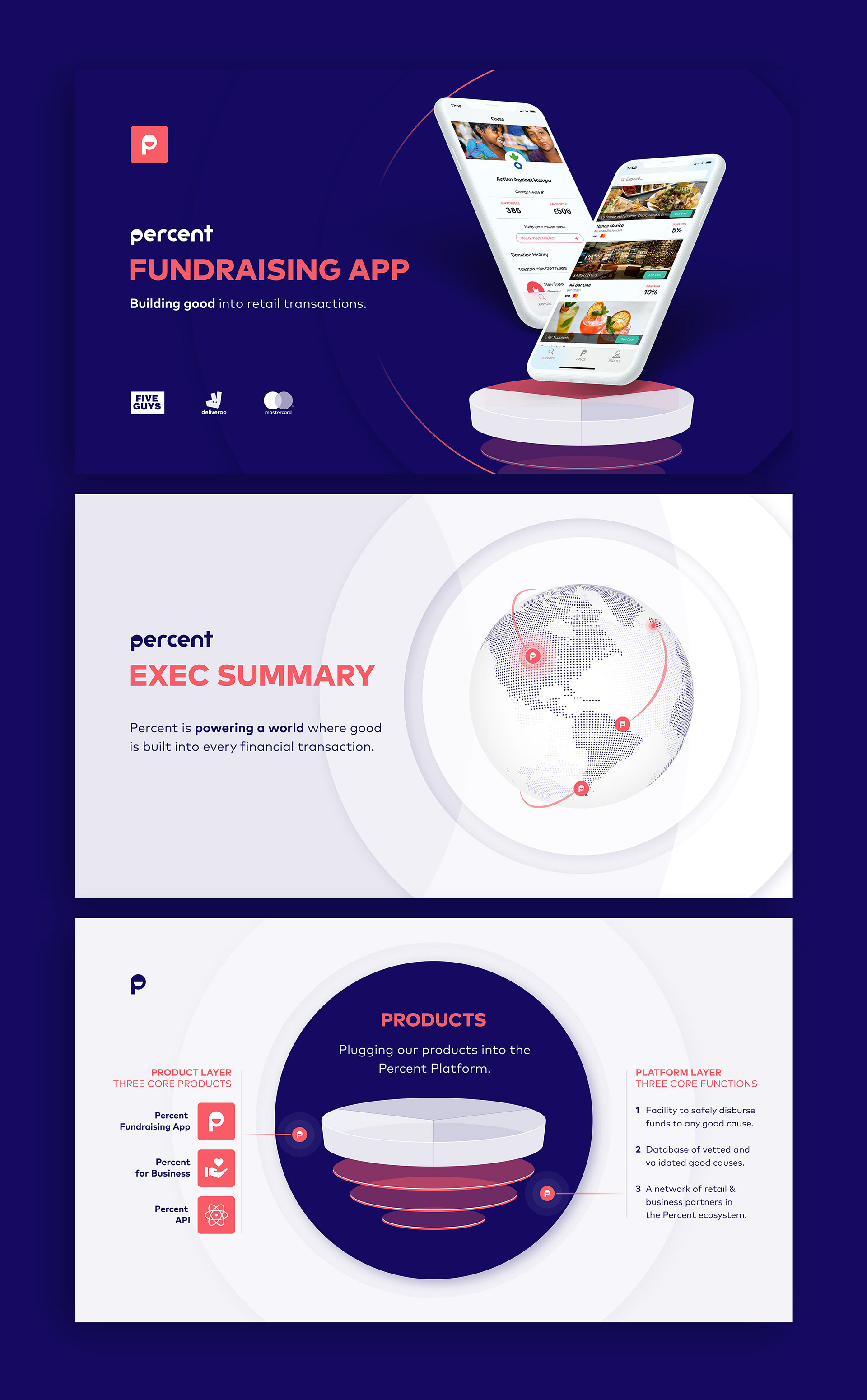 My work for Percent over the past 4 years has included collaborating with UI/UX designers on a brand design system and putting together engaging pitch decks and presentations, while ensuring brand consistency was always upheld. This work directly helped secure financial investment for the company. My presentations have been shown to large banks and corporations such as Coutts, Goldman Sachs, Nationwide, RBS, Netflix, TikTok and Tesco to name but a few.